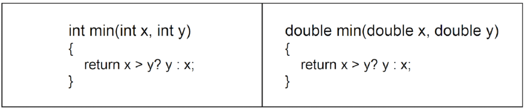 Let’s say you have written a function that returns a minimum of two integers. Now you realize you have to do the same for two doubles. You need to write a function that would return a minimum of two doubles. The internal logic of these two versions of the functions is identical, but the input data type is different. The possible implementation of the same could be as follows: