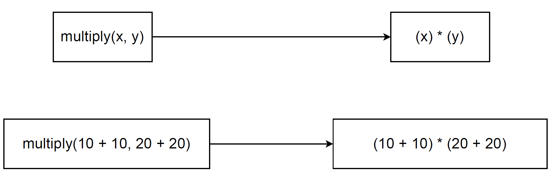 The output from the first call to multiply() is correct. In the second call, however, we pass two expressions as arguments: 10 + 10 and 20 + 20. The intended computation is (10 + 10) * (20 + 20), which should produce 800. Instead, the program prints 230, which is incorrect.