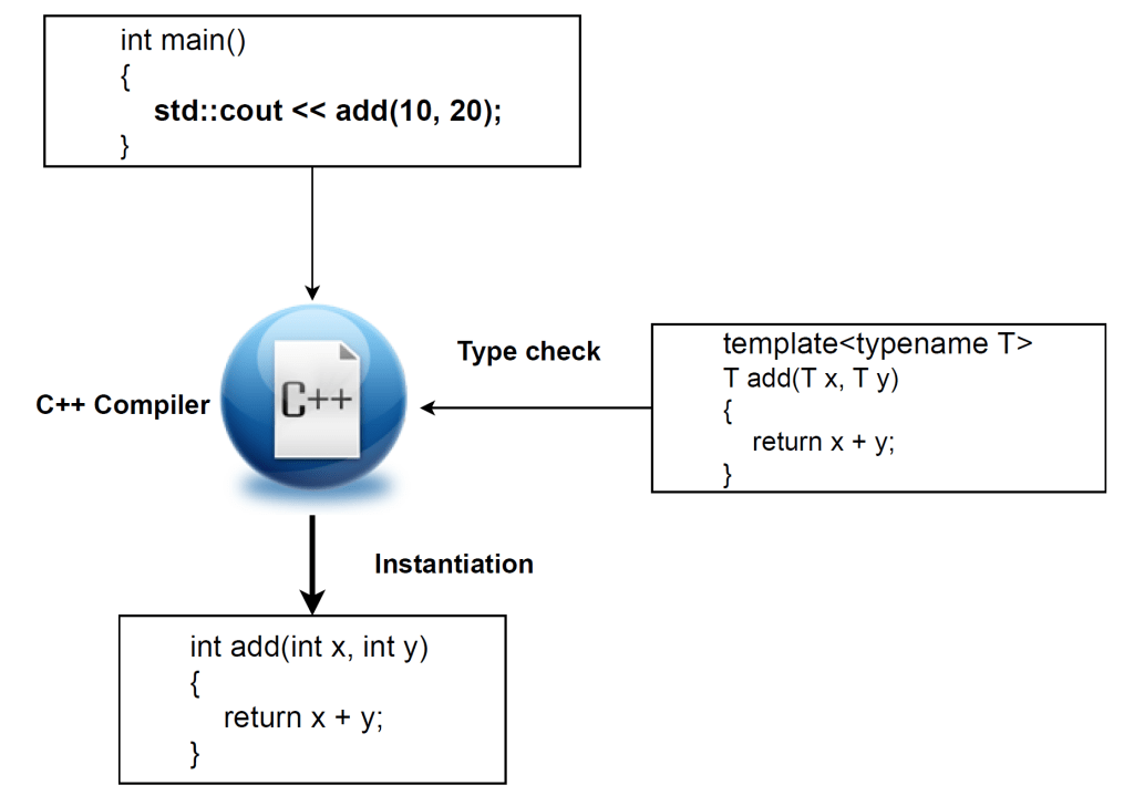 This is where generic programming in C++ comes in. It allows programmers to define functions or classes with generic data types. This enables the compiler to determine the appropriate type based on the arguments passed. Essentially, the programmer instructs the compiler:
