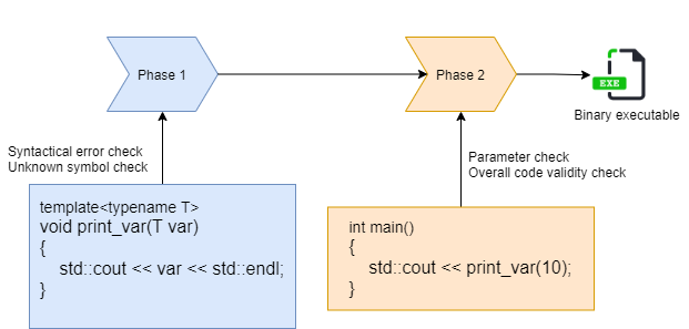 The C++ compiler processes a function template in two distinct phases. The exact behaviour can vary slightly across different compilers, but the underlying concept remains consistent.