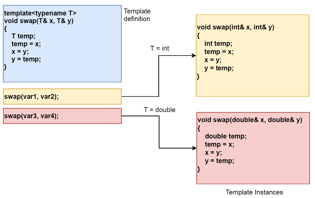 When a function template is invoked with specific arguments, the compiler deduces the argument types and binds them to the template parameter T. Based on this deduction, the compiler then generates a concrete instance of the function template by substituting T with the deduced type. In the next section, we examine this compiler processing of function templates in greater detail.