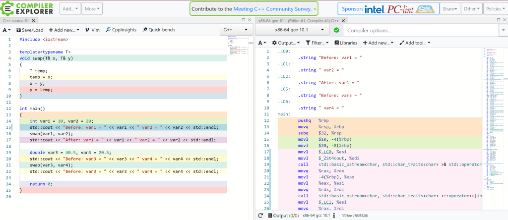As a result, var1 is implicitly converted to double. The comparison is then performed between two values of the same type. To check the type promotion of var1 from int to double, we used typeid. This allowed us to print the types of x and y inside the template function. Since the template is explicitly instantiated with double, both parameters are treated as double within the function body. If you compile and run the program, you will see the following output: