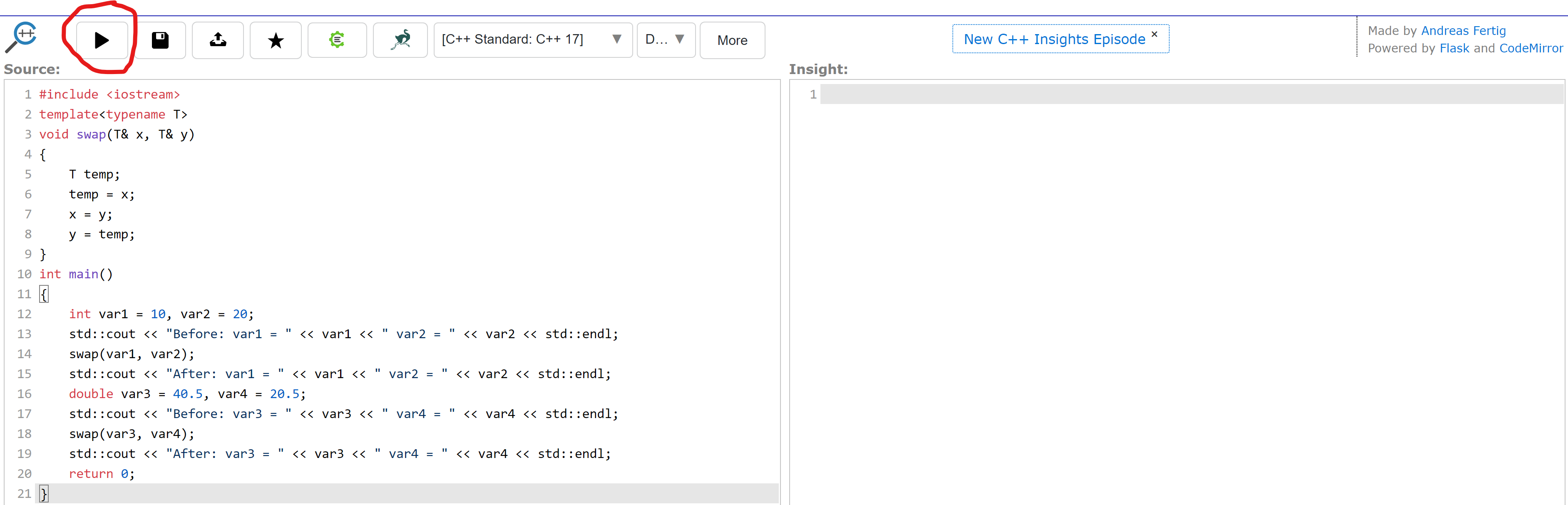 To proceed further, we first correct the missing semicolon in the body of the foo function template, as shown below.
