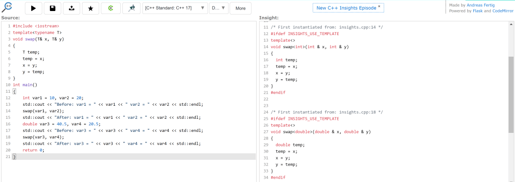 To prove that the compiler converts the var1 to double we have used typeid to print the types of x and y in the template function. If you compile and run the program, you will see the following: