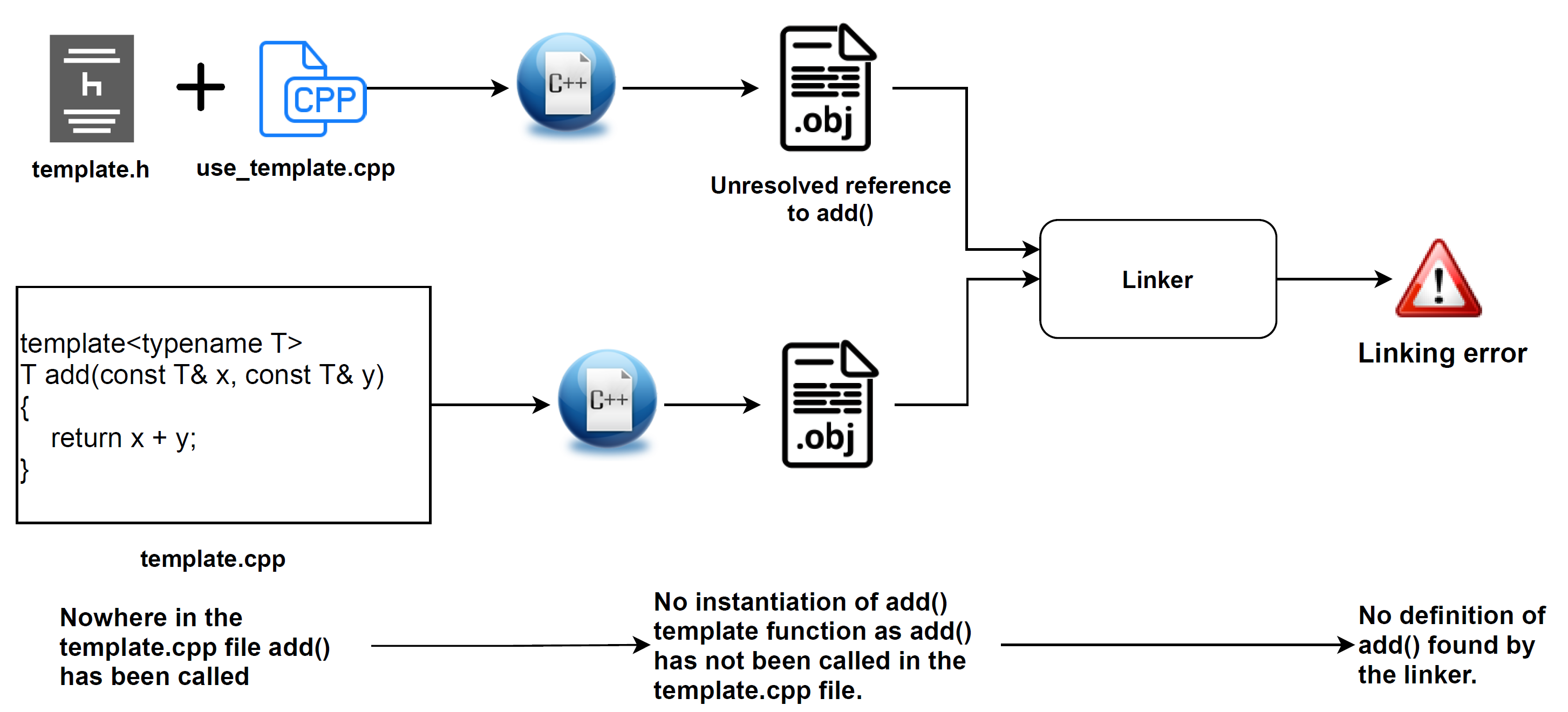 - Once all the cpp files are compiled, in our case, when both the use_function.cpp and the function.cpp are compiled, the linker takes both the object files and links the missing definition of add() to the caller of the function. And hence, there is no error. The following is the pictorial representation of the compilation and linking process for non-template functions.