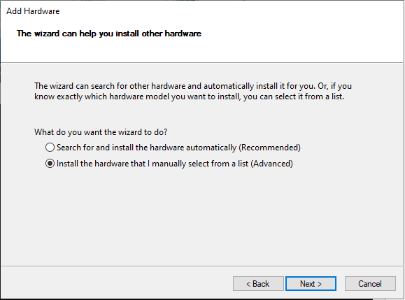 Click Next. Then select “Install the hardware that I manually select from a list (Advanced)” as selected below: