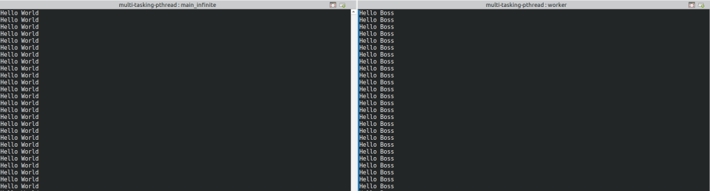 Left Console (main_infinite) repeatedly prints "Hello World".