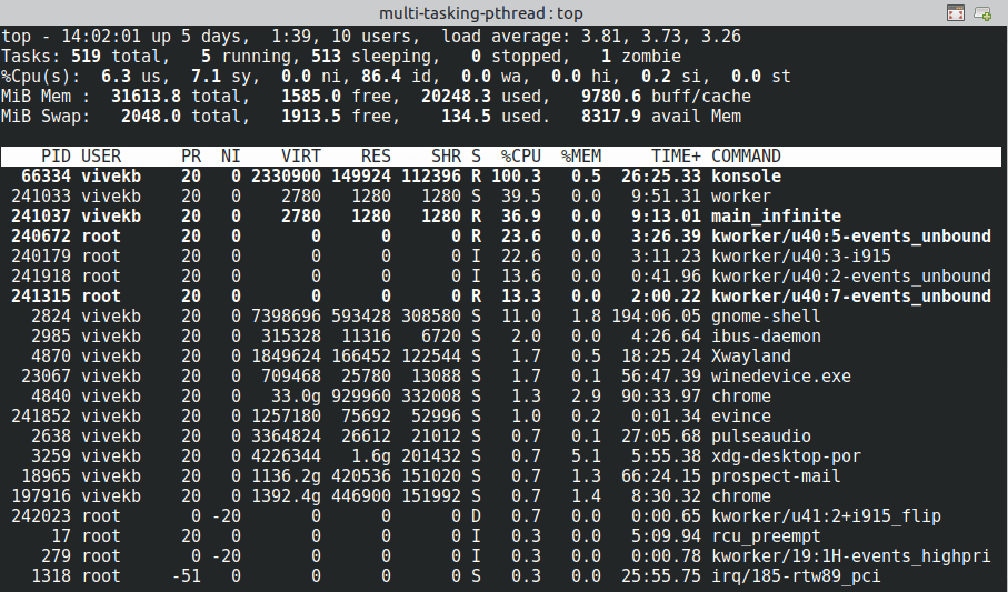 We can use a popular command top to observe how these two programs are running in the single CPU. As seen in the following screenshot, top command output, both programs—worker and main_infinite—are actively running. However, a closer look at the CPU usage column reveals an important insight: