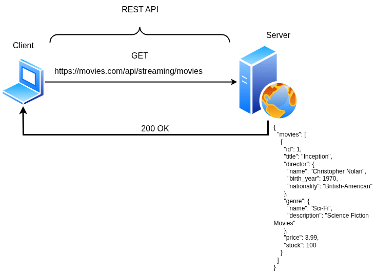 This is how resources are typically structured on the server. When you query the base URL, the server responds with a JSON object. This object contains high-level information about the service, such as the streaming platform details. It also includes the resources it manages, like a list of movies.