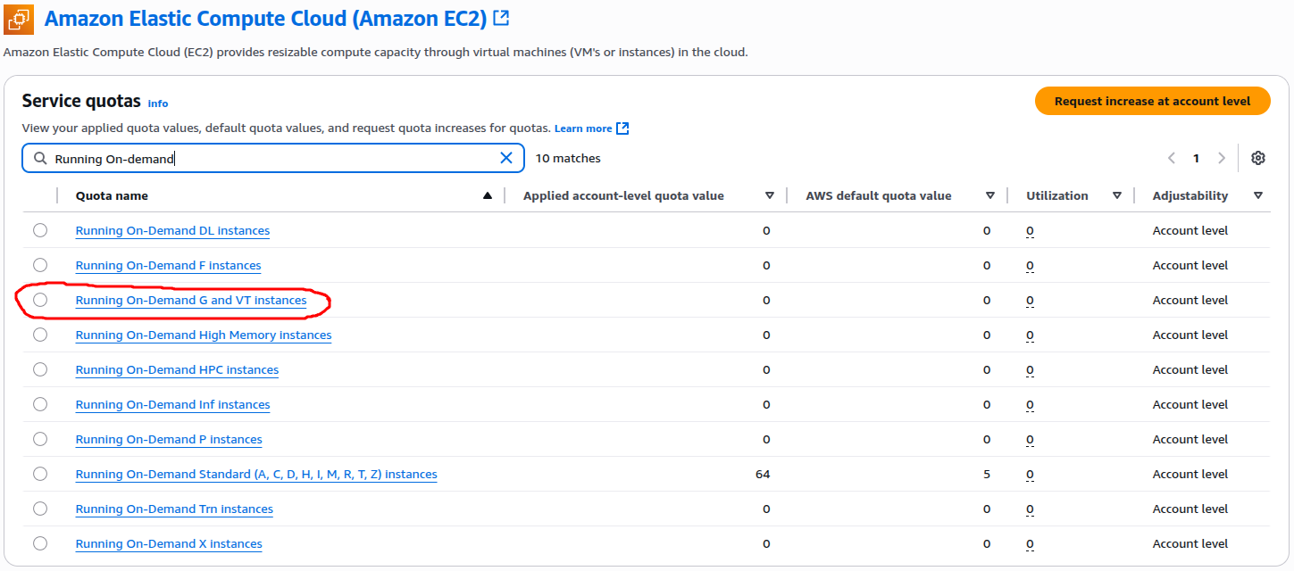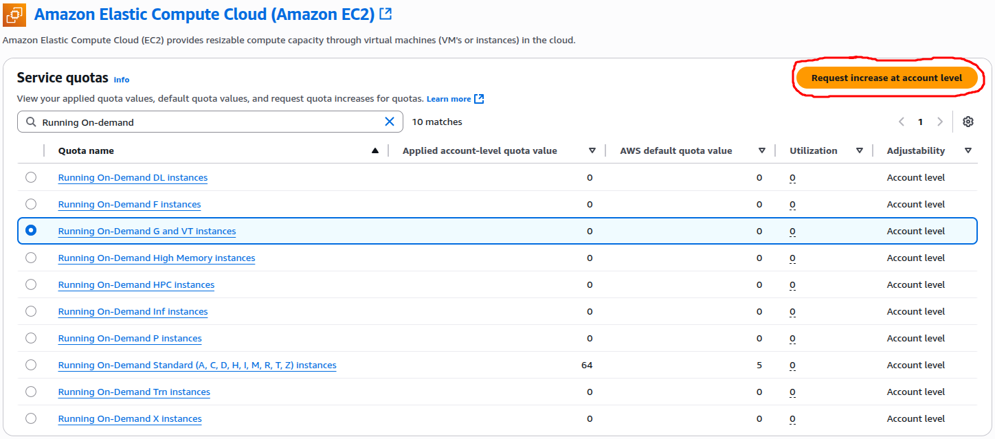 In my case, the vCPU quota for the GPU family (g4dn) was set to zero. This meant I couldn’t launch any GPU-backed EC2 instance. I needed to increase this limit first.