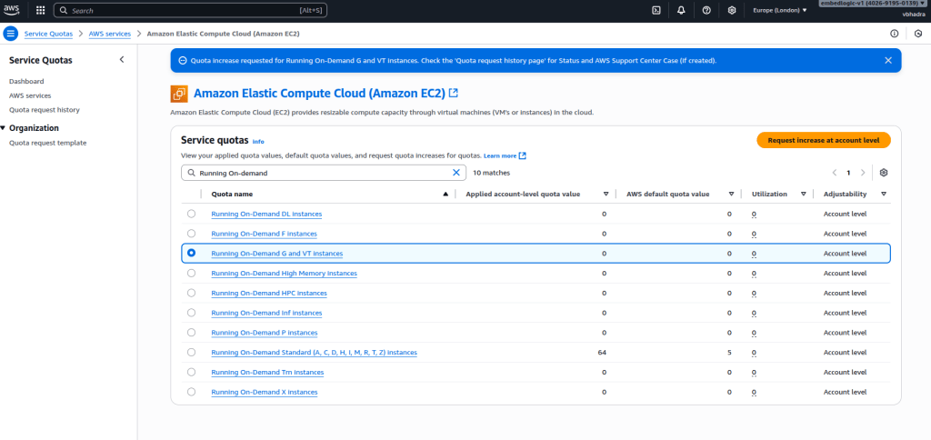 At this stage, my request for the Running On-Demand G and VT Instances quota appeared as Pending. This means AWS had received it and was reviewing it. The approval can take a few minutes to several hours. The duration depends on the type of instance and the selected region.