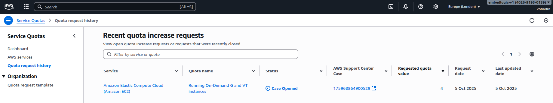 To confirm that my request had gone through properly, I clicked on Quota request history from the left-hand menu. This page lists all your recent quota increase requests. It shows their type. It also displays their current status and any associated AWS support cases.