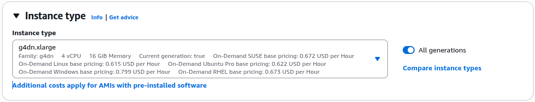 Next, choose the instance type g4dn.xlarge (1× T4 GPU).