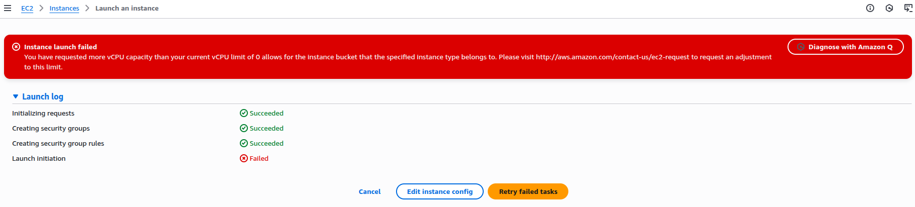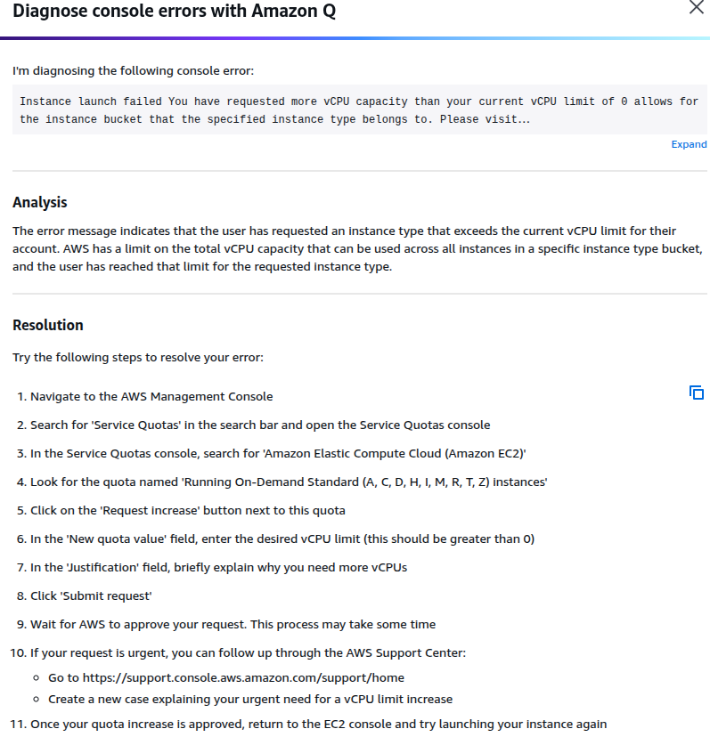 To understand the situation better, I used the “Diagnose with Amazon Q” option. It appeared right beside the error message. AWS’s diagnostic tool analysed the failed instance launch and provided a detailed breakdown of the issue.