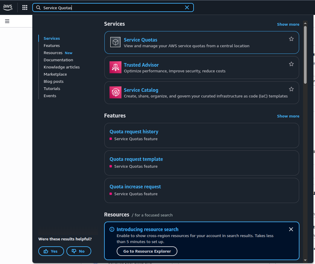 With the issue clearly identified, the next step was to request an increase in my vCPU quota for GPU instances. Thankfully, AWS provides a centralized way to manage such limits through the Service Quotas console. To open the Service Quotas console, I simply searched for “Service Quotas” from the AWS Management Console’s search bar. This tool lets you view, track, and request quota increases across different AWS services — all from a single place.