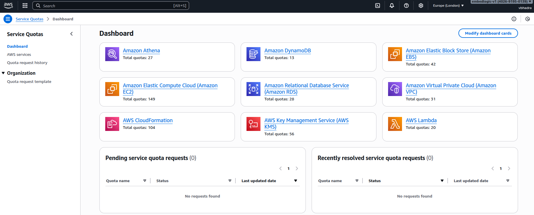 Once inside, I clicked on Dashboard from the left-hand menu. This brings up a list of all available AWS services for which quotas can be managed.