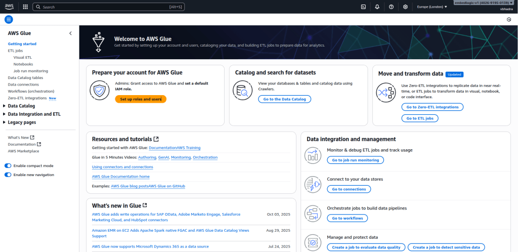 AWS Glue is a fully managed data integration service. It is serverless and comes from Amazon Web Services. This service is designed to build, run, and orchestrate extract-transform-load (ETL) pipelines at scale. It streamlines data engineering workflows by automatically provisioning resources, managing dependencies, and scaling execution environments without infrastructure management. Glue supports both visual (no-code) and code-based job authoring and integrates seamlessly with services like S3, Athena, Lambda, and CloudWatch. It also includes a metadata catalog for tracking and querying datasets across the data lake.
