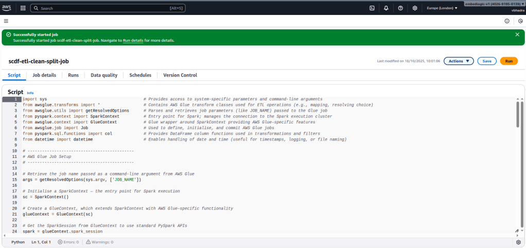 The Python script below implements a complete Extract–Transform–Load (ETL) pipeline using AWS Glue and PySpark. It reads raw sales data from Amazon S3 and cleans it. Then, it converts the data to a more efficient storage format. The data is split into training and testing subsets. Finally, it writes the results back to S3 while maintaining Glue’s job-tracking capabilities.