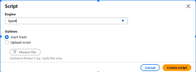 We will use Script Editor. Click on the Script Editor icon on the right. It will ask to choose Engine to use, select Spark and in Options Start Fresh. Both are thankfully default options.
