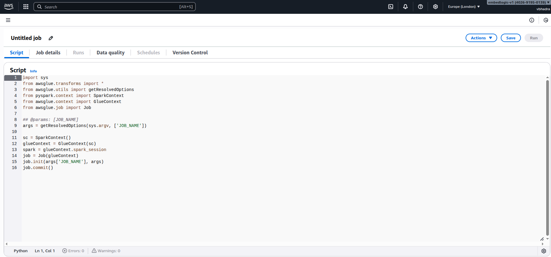 The script we are developing begins by importing the necessary libraries and setting up the AWS Glue job environment. This includes SparkContext, GlueContext, and Job, which collectively provide the execution context for distributed ETL operations.