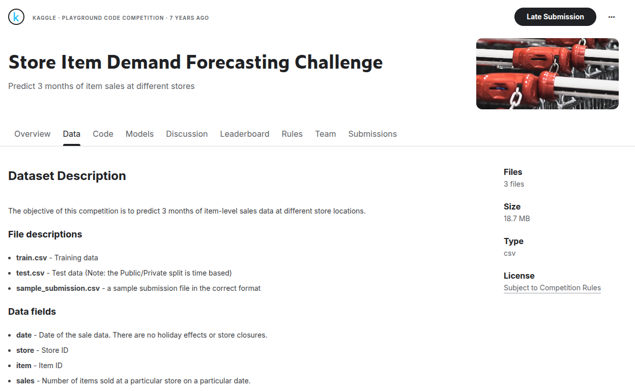 For this project, we selected the publicly available dataset from the Kaggle Store Item Demand Forecasting Challenge. This dataset provides historical daily sales figures. It includes 50 unique items sold across 10 different stores. The data spans a 5-year period (2013–2018). This setup simulates realistic demand fluctuations in the retail industry.