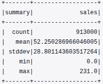 - The minimum and maximum sales values (0.0 to 231.0) reflect a realistic range of retail transactions across different store-item combinations.