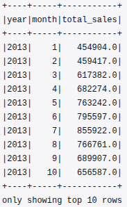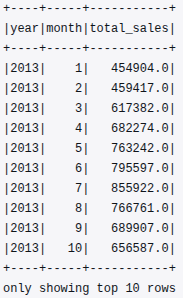 monthly_sales = df.groupBy("year", "month").agg(_sum("sales").alias("total_sales")).orderBy("year", "month")