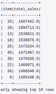 item_sales = df.groupBy("item").agg(_sum("sales").alias("total_sales")).orderBy(col("total_sales").desc())