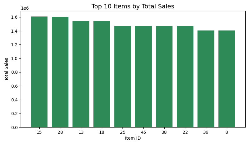 The results show that items 15, 28, and 13 were the highest contributors to total sales during the analyzed period. This insight will be particularly valuable during feature engineering. Item-level popularity can enrich predictive features. Historical demand strength can also be used for machine learning.