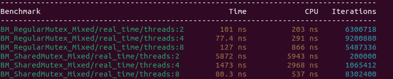 From the benchmark results, it is clear that with two threads std::shared_mutex records a Real Time of 7875 nanoseconds, which is significantly higher than the 848 nanoseconds observed with std::mutex. This behaviour is expected in a low-concurrency configuration where there is only one reader and one writer. In such a case, access to the shared data is effectively serialized, and the shared mutex is unable to exploit its core advantage of concurrent reads.