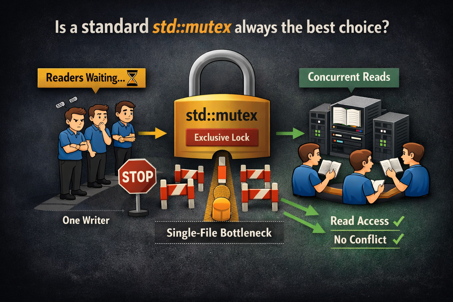 Is std::mutex always the best choice in C++ multithreading? Consider a classic C++ reader-writer scenario where multiple threads need to read shared data, but only one thread writes to it. Developers often default to a standard std::mutex for protection in this kind of scenario.