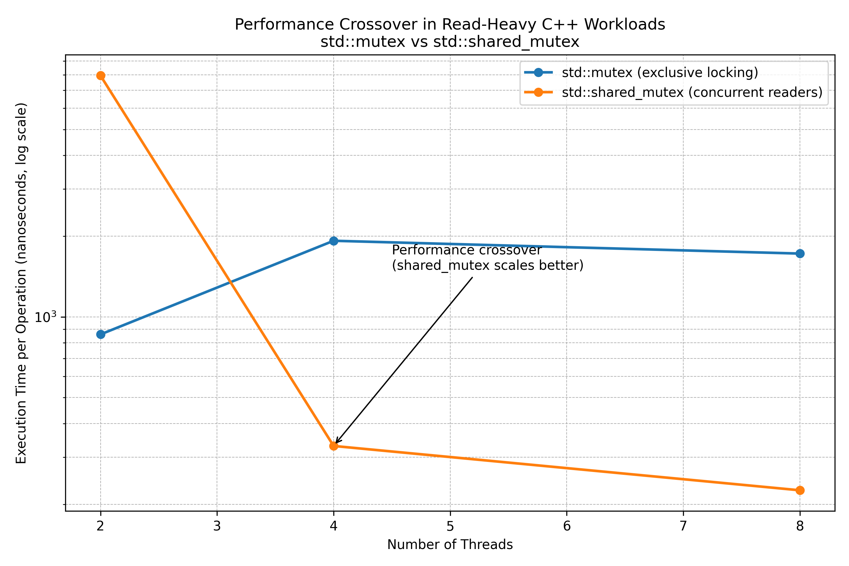 std::mutexremains a strong and efficient choice for low concurrency scenarios or write-heavy designs, where exclusive access is unavoidable anyway.- As reader concurrency increases, exclusive locking becomes a bottleneck, while shared locking allows the system to make better use of available CPU cores.